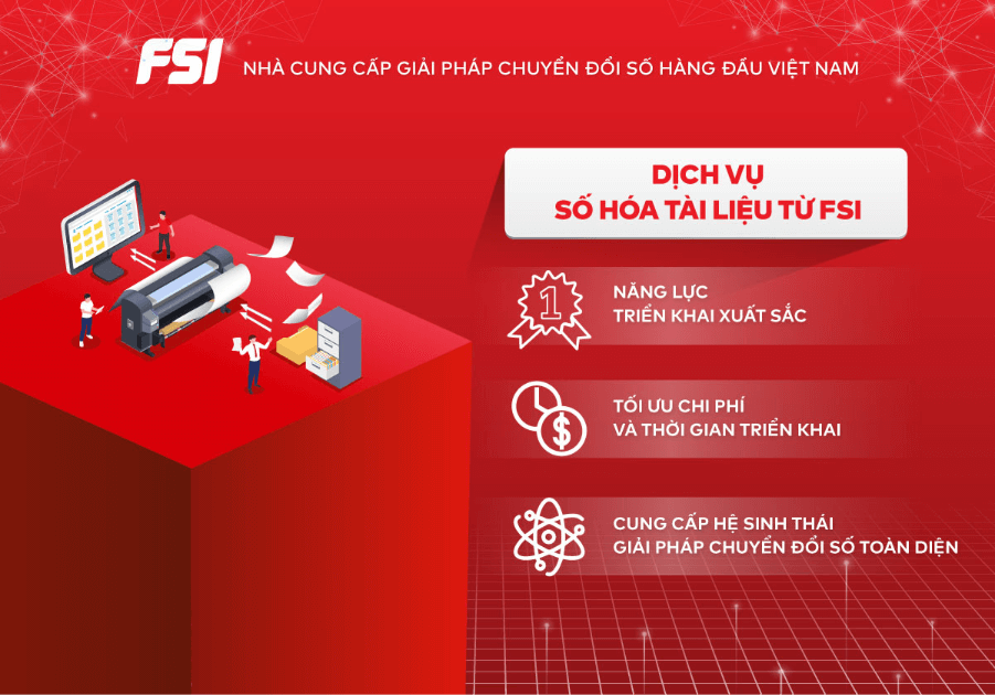 Với hơn 18 năm kinh nghiệm trong lĩnh vực số hóa tài liệu, FSI hiện là một trong những đơn vị tiên phong cung cấp giải pháp chuyển đổi số cho các tổ chức, doanh nghiệp tại Việt Nam. FSI đã đồng hành cùng hơn 5.500 khách hàng, trong đó có nhiều ngân hàng lớn như VietinBank, MB Bank, VPBank, HSBC, Techcombank… giúp chuẩn hóa quy trình lưu trữ, nâng cao hiệu quả quản lý hồ sơ và đảm bảo tuân thủ yêu cầu khắt khe của ngành.